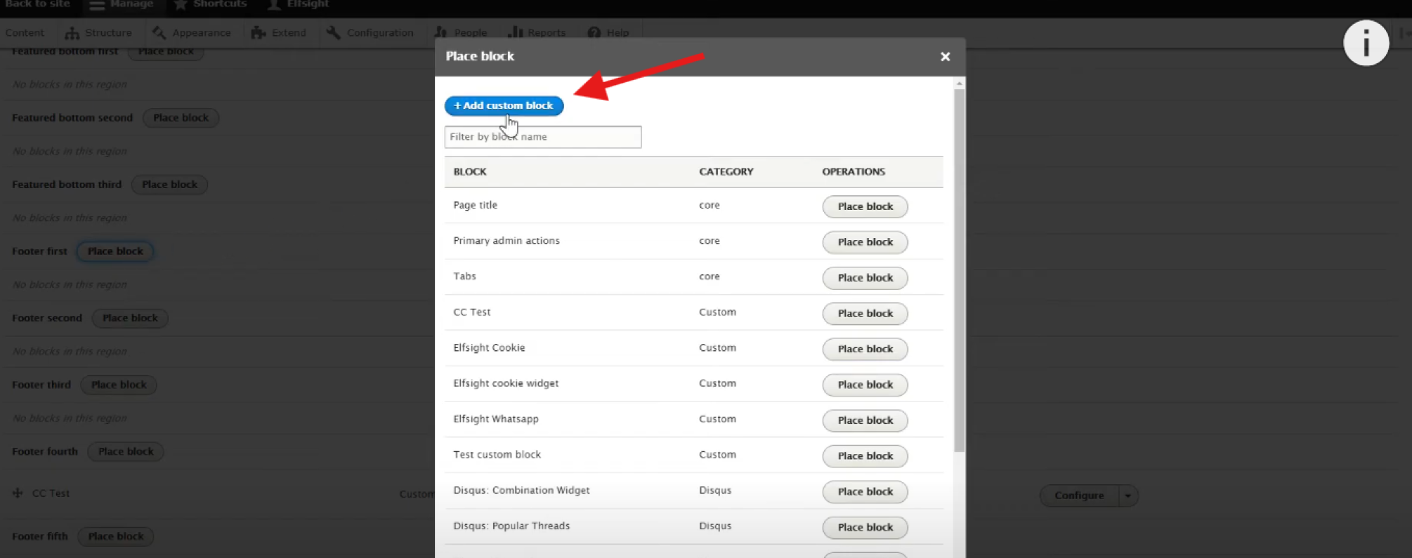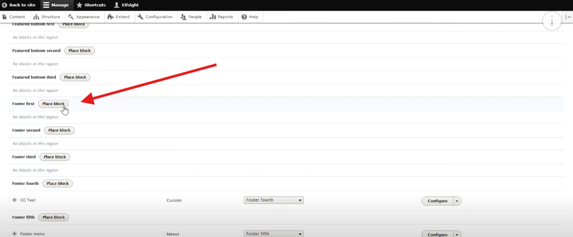 Scroll down and select any footer section, such as"Footer First"and click"Place Block".