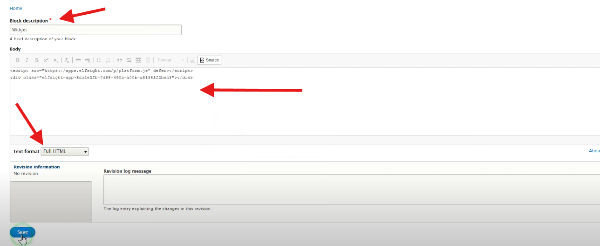 Enter a name for the block and then change the text format to "Full HTML" . Once that's done, please paste the Tabnav AI widget into the text section. Click on "Save"to apply your changes.