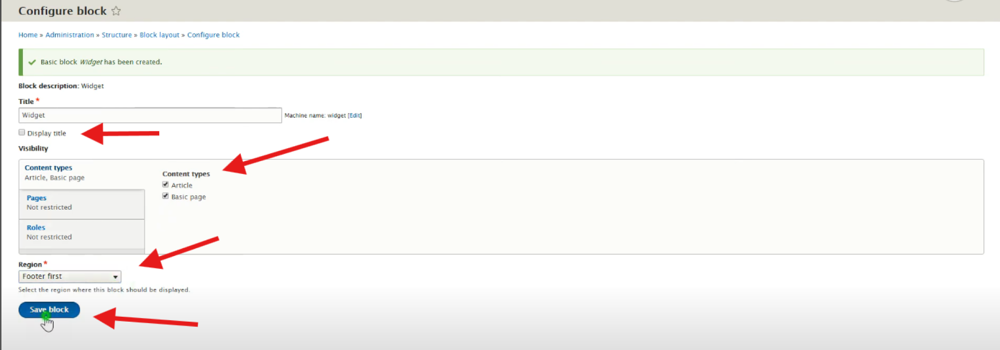 Next, uncheck "Display title", and then select all the pages you'd like to display the widget on the "Content types" tab. Then, choose the needed region (Footer First), and click "Save block" to apply the changes.