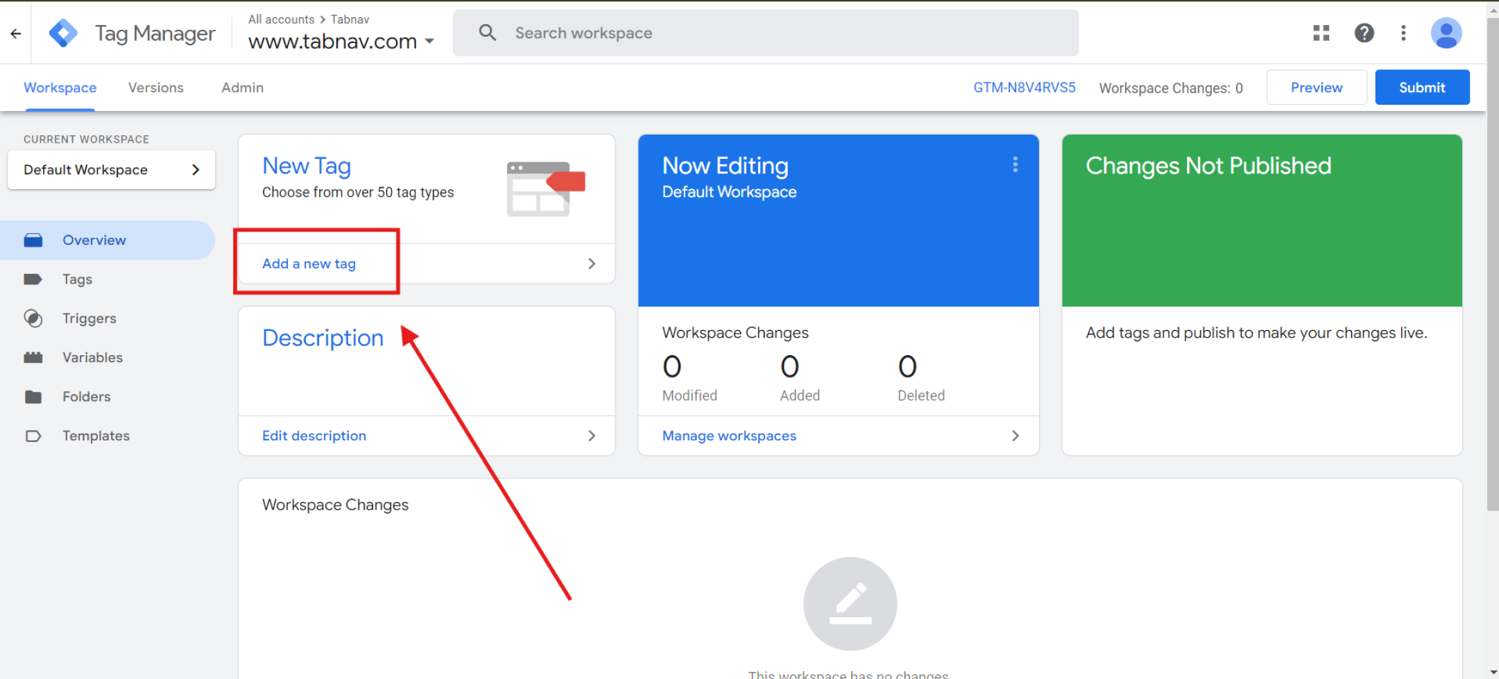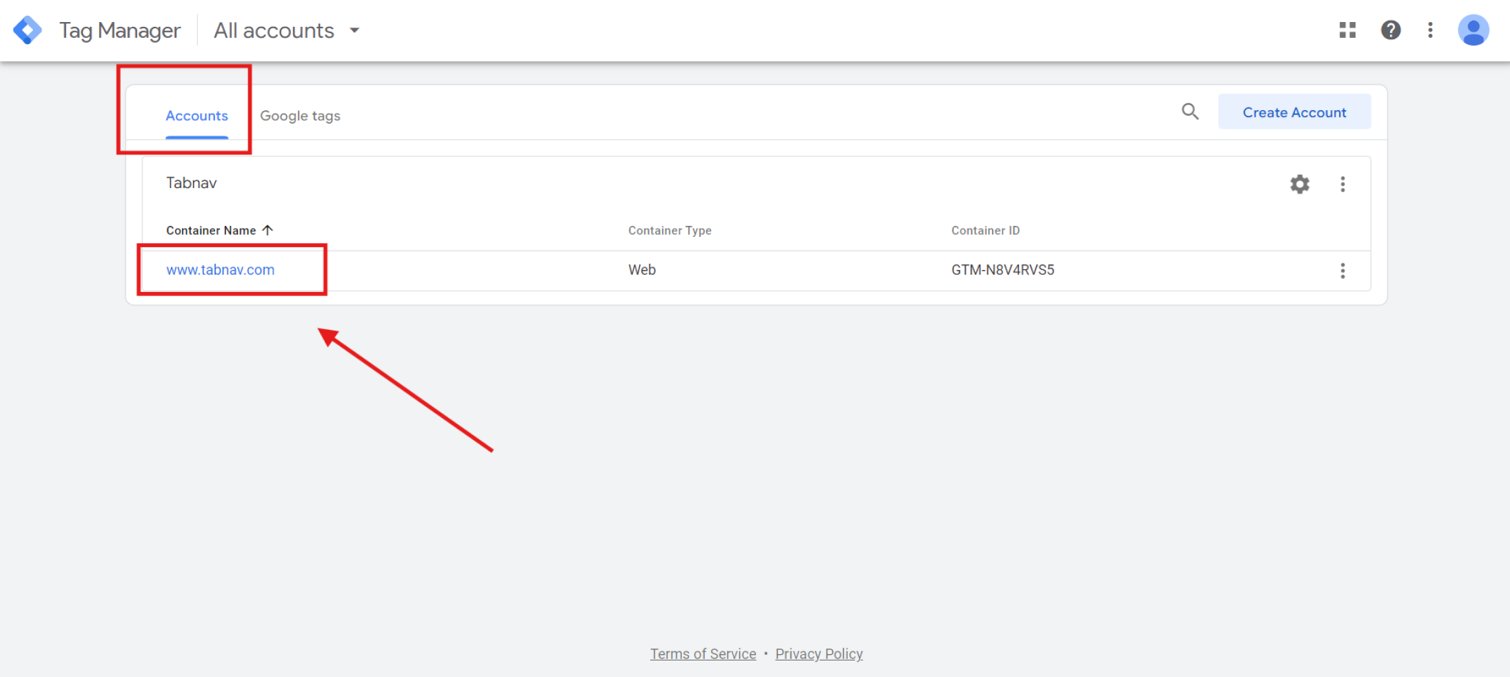 Log in to your Google Tag Manager account and select the "Website" where you would like to insert the tabnav AI accessibility widget.