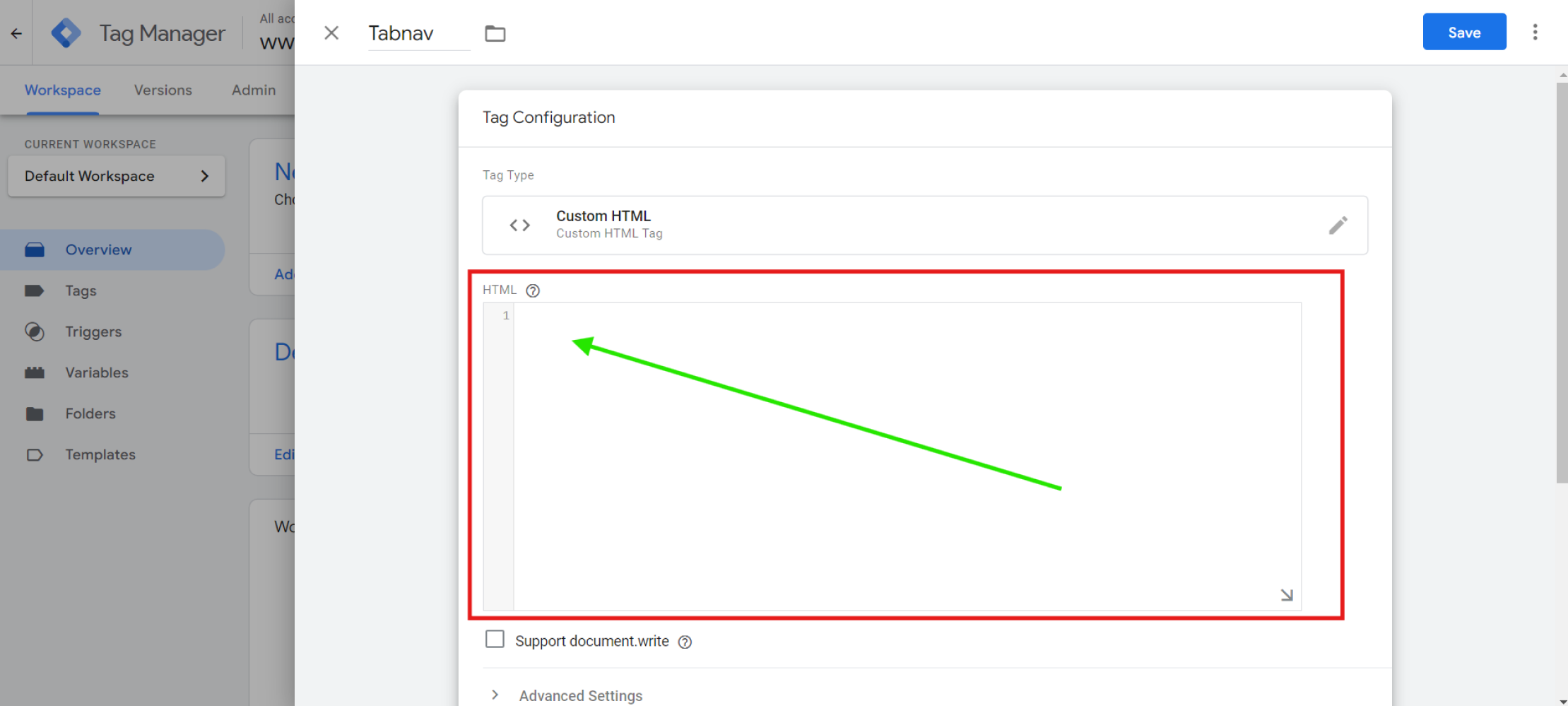 In the new window, please navigate to the "HTML" text area and paste the tabnav AI accessibility widget.