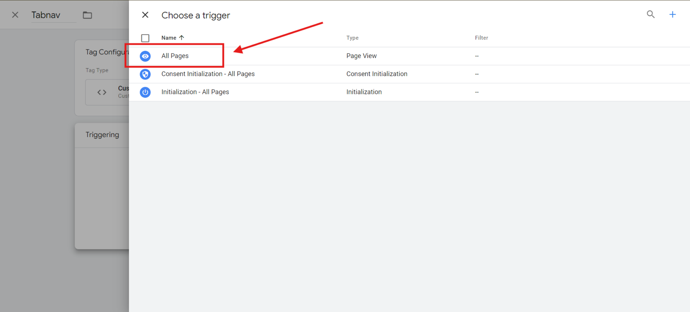 Next, to ensure the tabnav widget will appear on all pages, navigate to the "Triggering" container by scrolling down and clicking anywhere on the "Triggering" container.