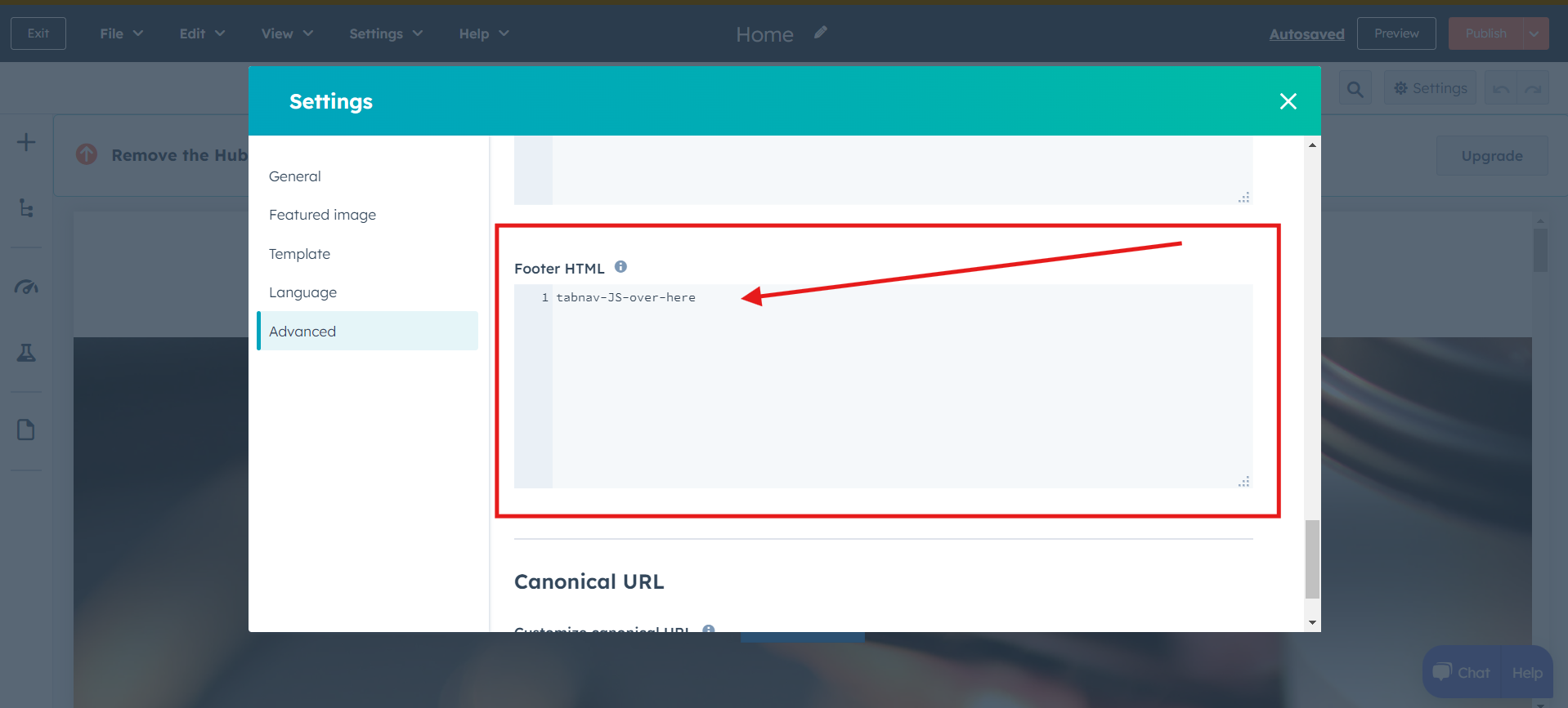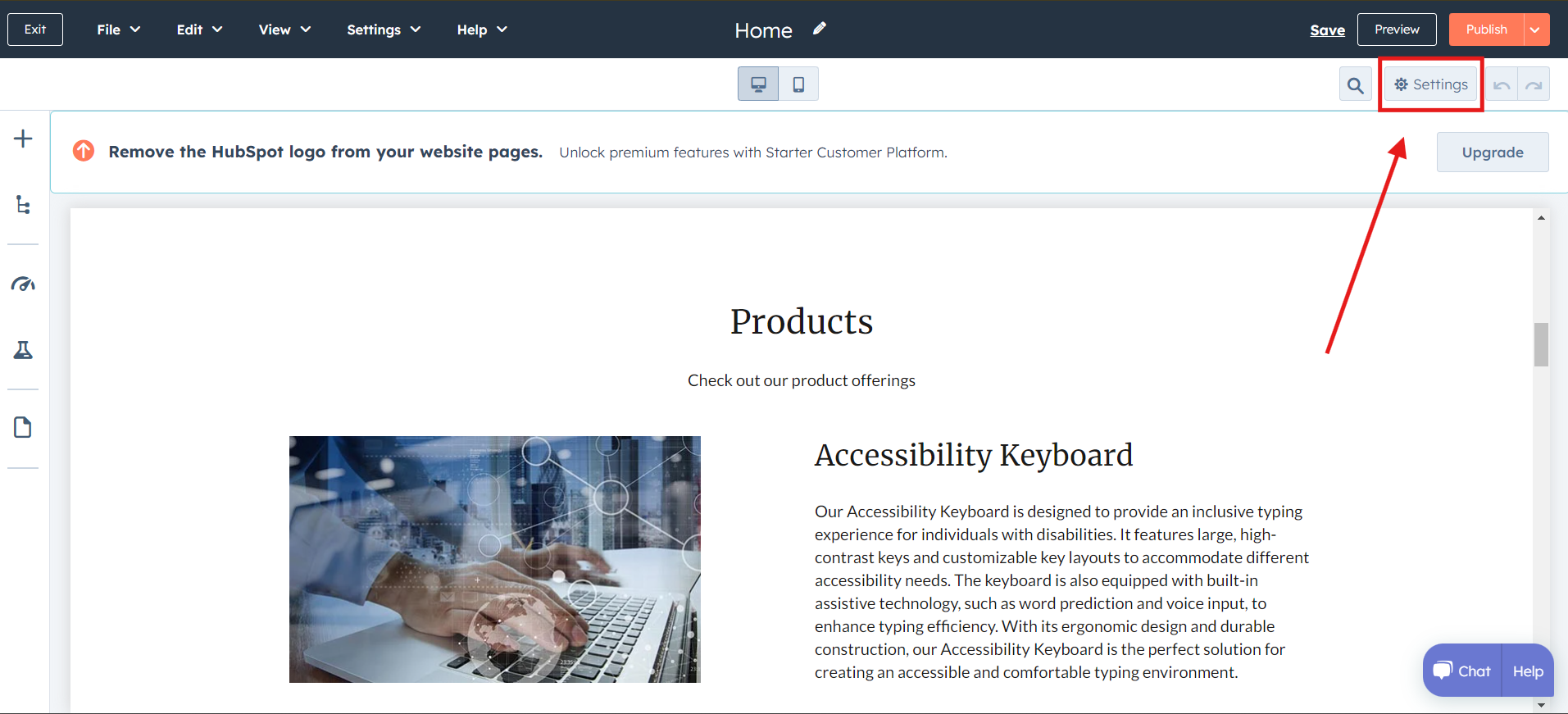 In the HubSpot site editor, navigate to the "Settings" section located on the top panel.