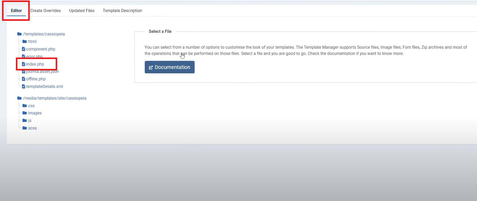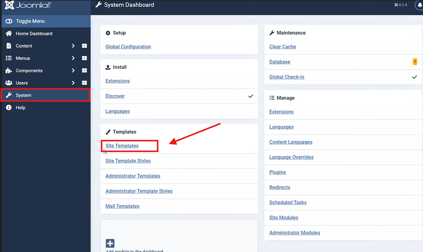 Log in to your Joomla dashboard, and on the left side panel you will find "System" tab, then navigate to the link "site templates".