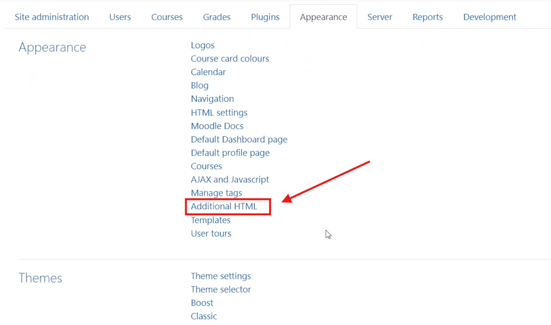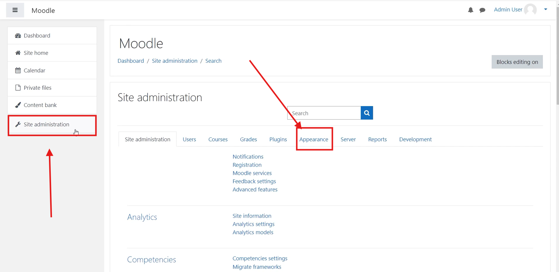 Log in to your Moodle Dashboard. On the left-side navigation panel, select "Site administration". Then, on the new page that opens, select the "Appearance" tab.