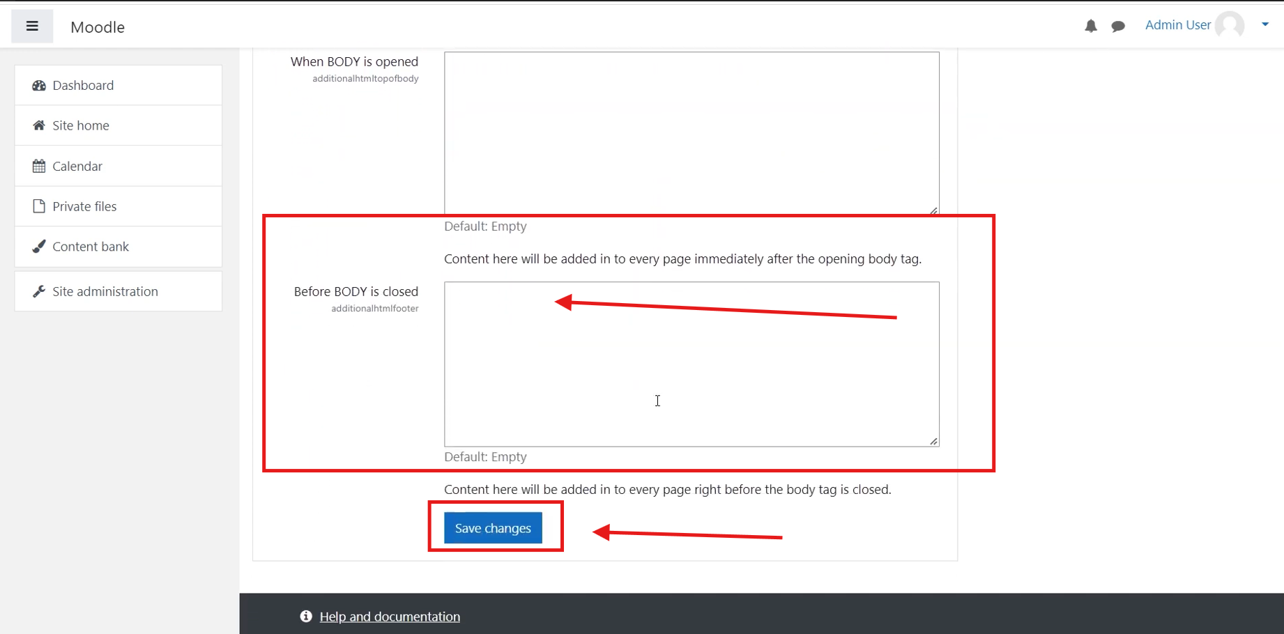On the Additional HTML page, scroll down and past tabnav AI widget code on the "Before BODY is closed" text area.