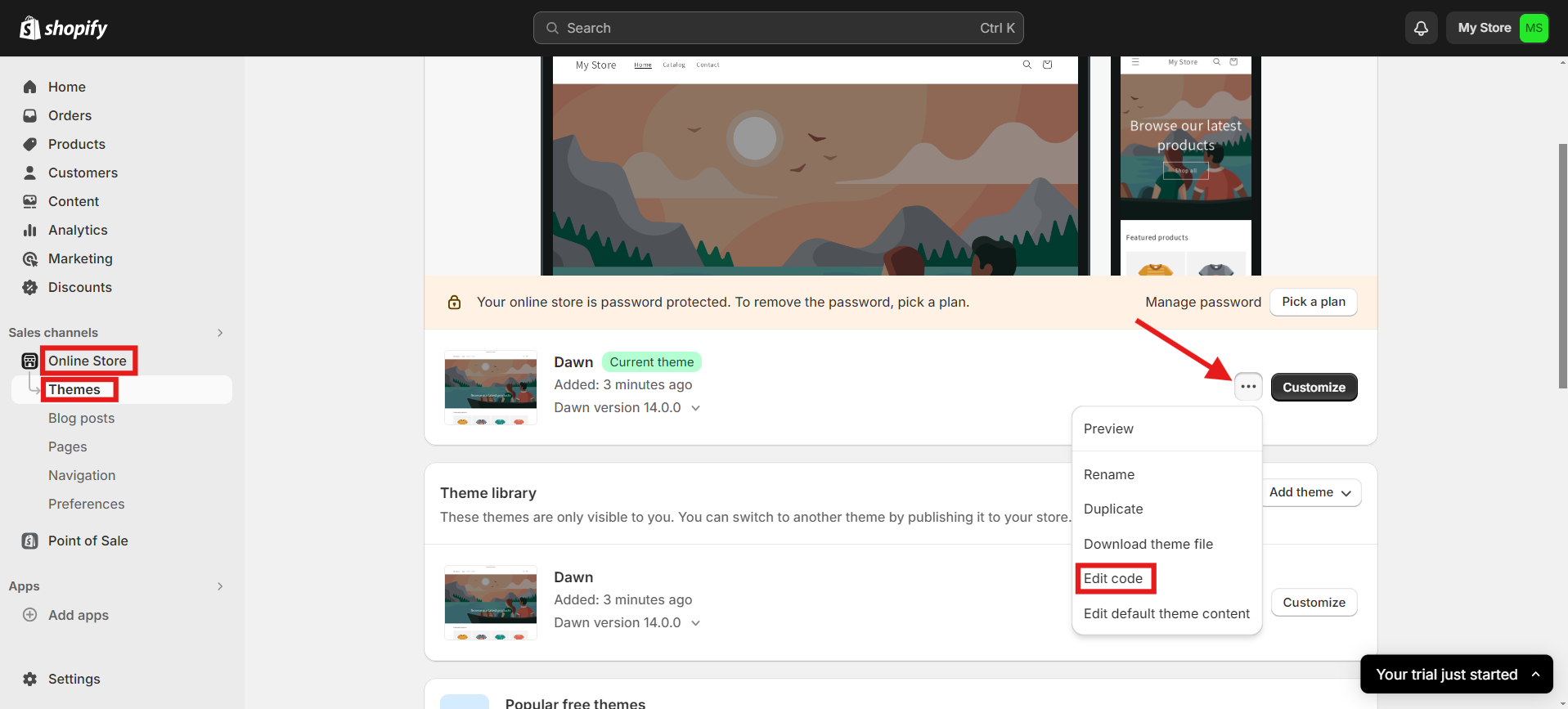 Log in to your site management. Next, navigate to the bottom left menu and select "Online Store" > "Themes". Then, click on the 3 dots icon dropdown menu and choose "Edit Code".