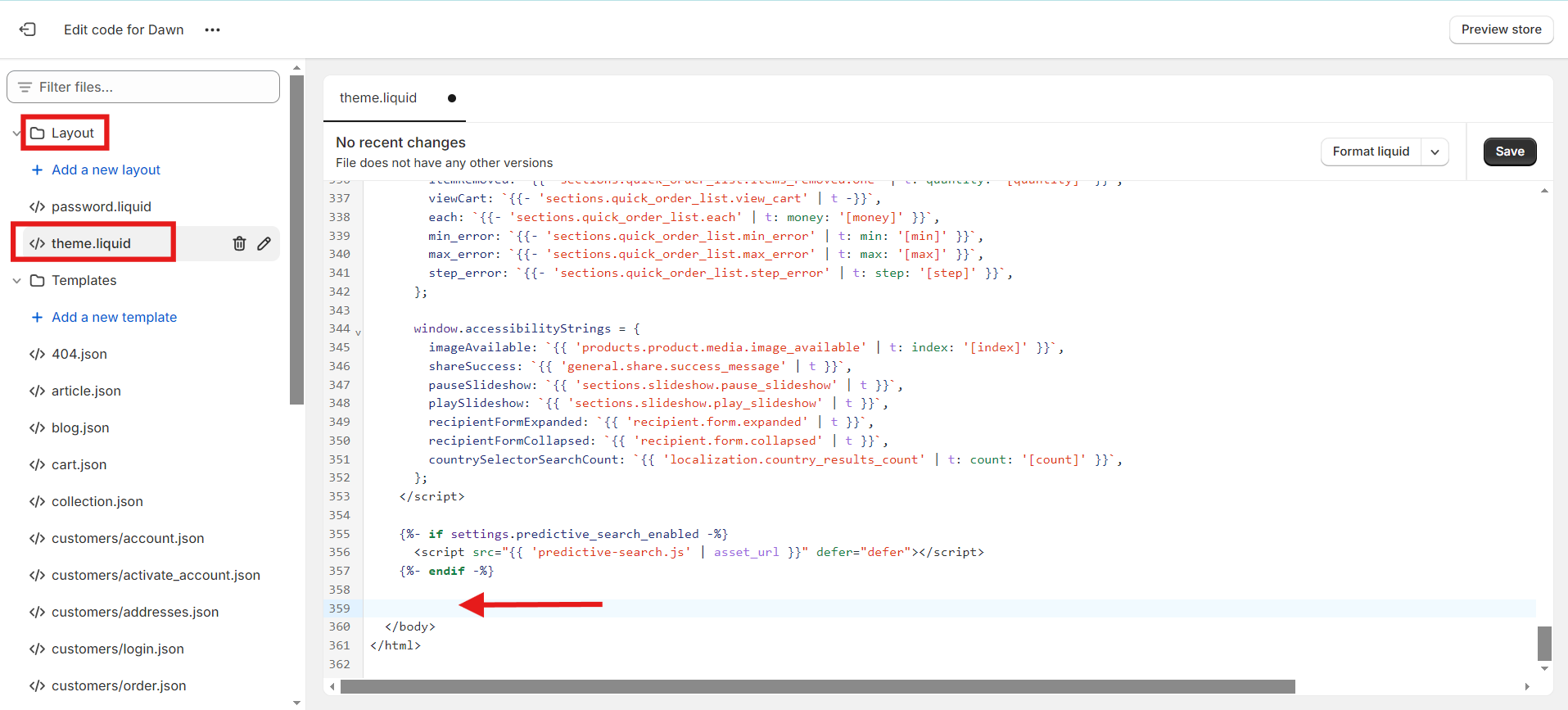 Go to the Layout section and click on the theme.liquid file. Scroll down until you locate the closing body tag. Paste your tabnav AI widget JavaScript embed code just before the closing tag.
