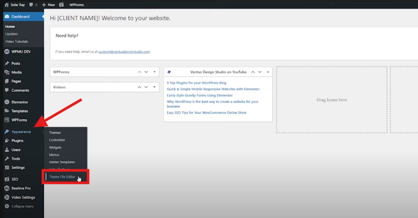 Log in to your site management.To access the Theme File Editor in your WordPress dashboard, navigate to "Appearance" tab and then select "Theme File Editor".